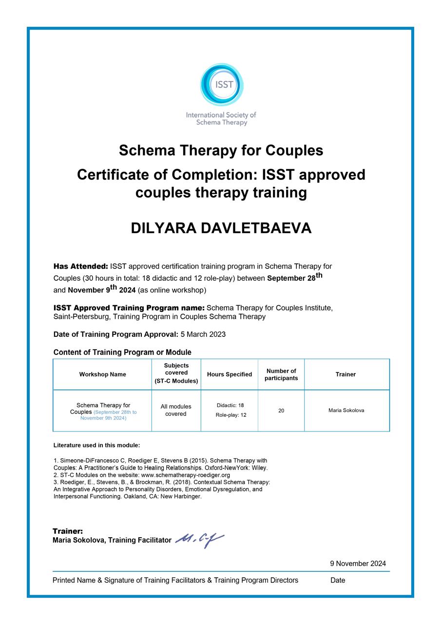 - 2024 год «Психологическое консультирование пар в подходе схема-терапия» (психологический центр «Качество Жизни»)