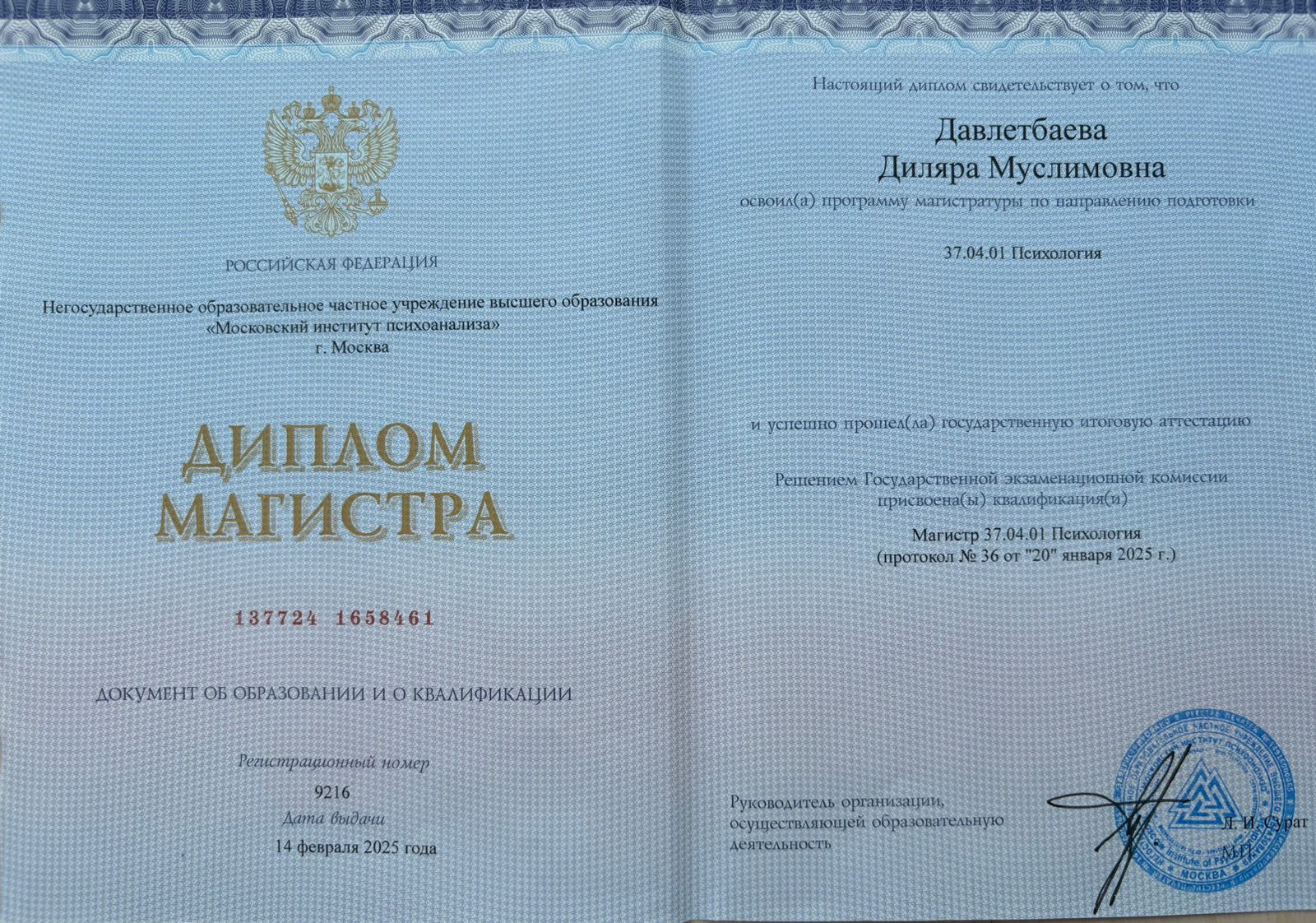 2022- 2025 Московский Институт Психоанализа. Магистр. Клинико-психологическое консультирование с основами психотерапии