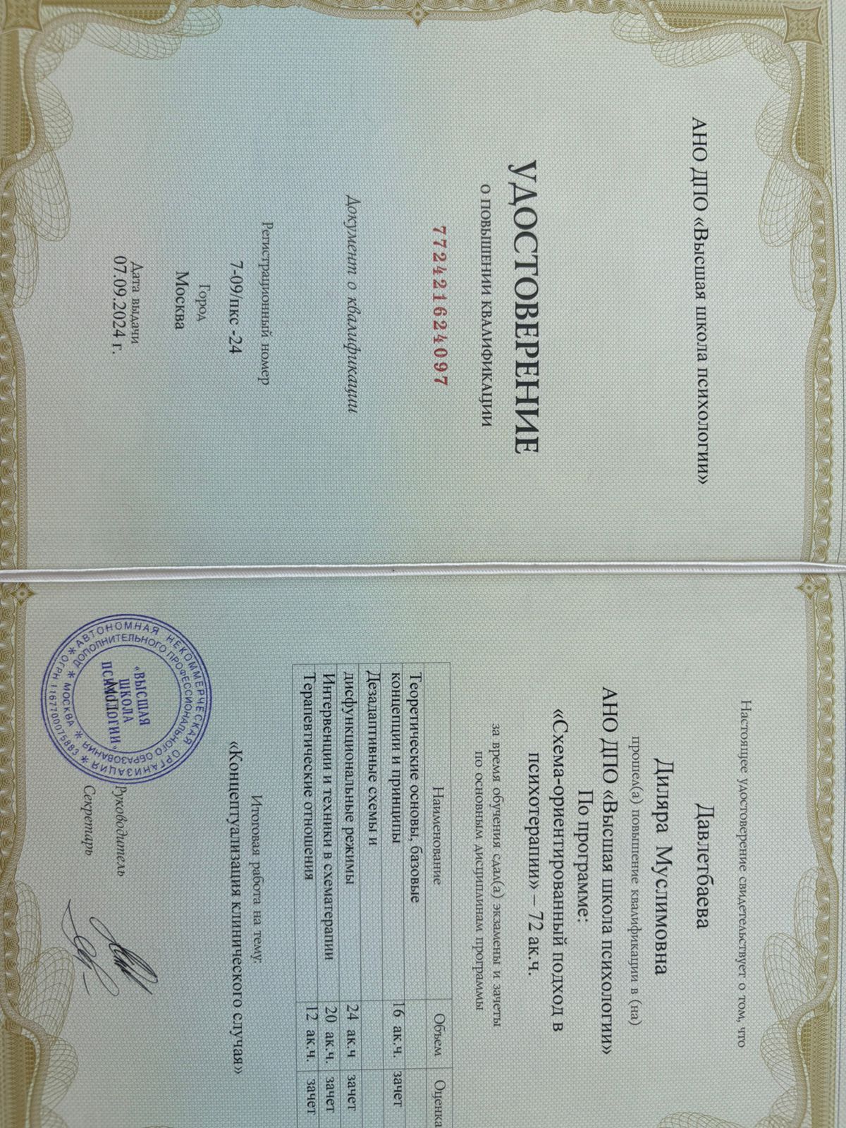 - 2024 год Схема-ориентированный подход в психотерапии (АНО ДПО «Высшая школа психологии»)