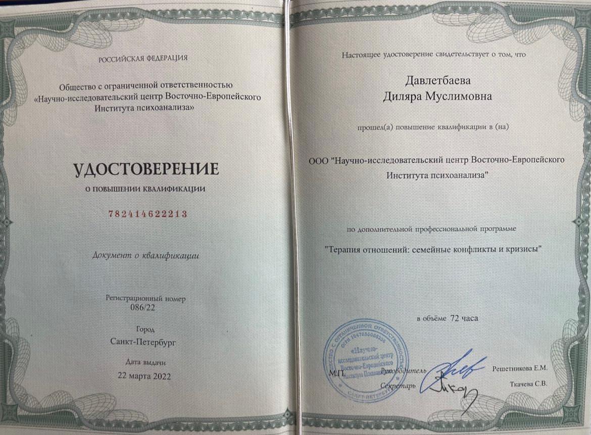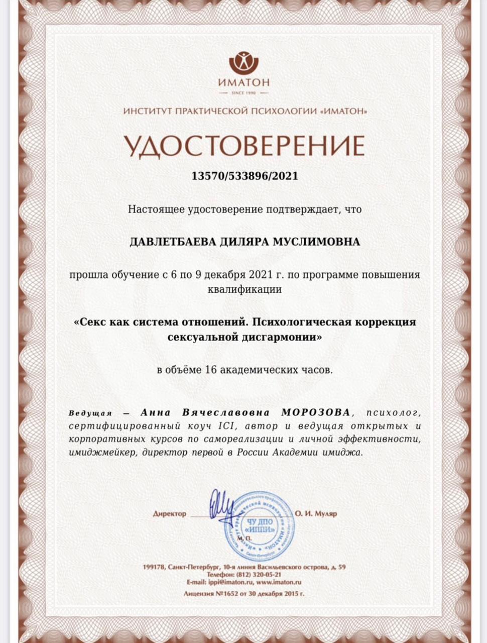 - 2022 год «Тренерское мастерство» (Тренинговая Компания EQuator); - 2021 год «Семейное консультирование» (ИПК «Новый век»);