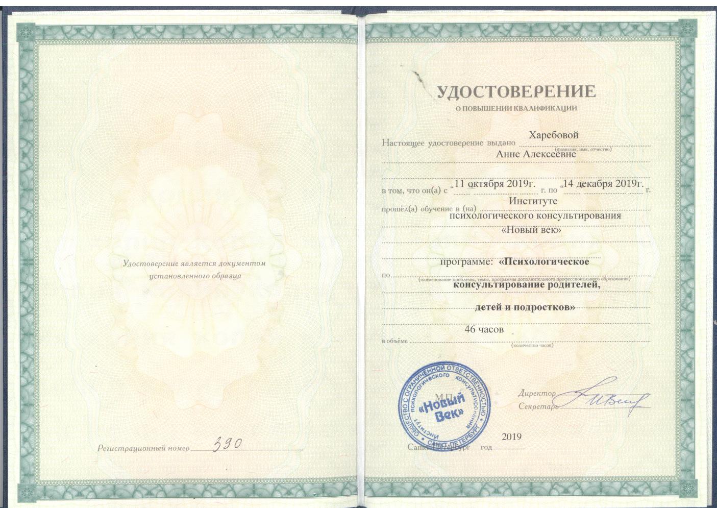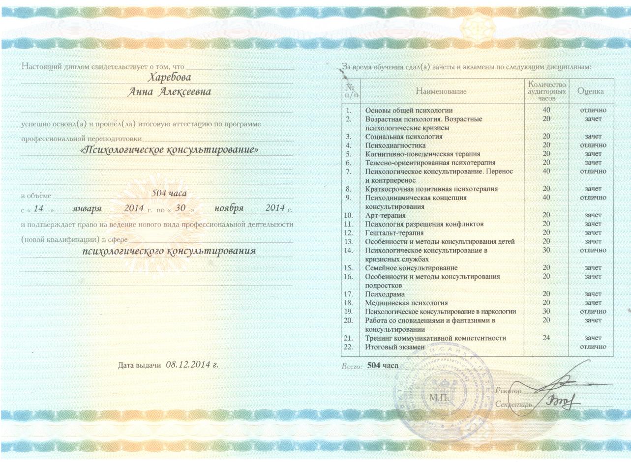 - Институт психологического консультирования «Новый век», специальность «Психолог – консультант».