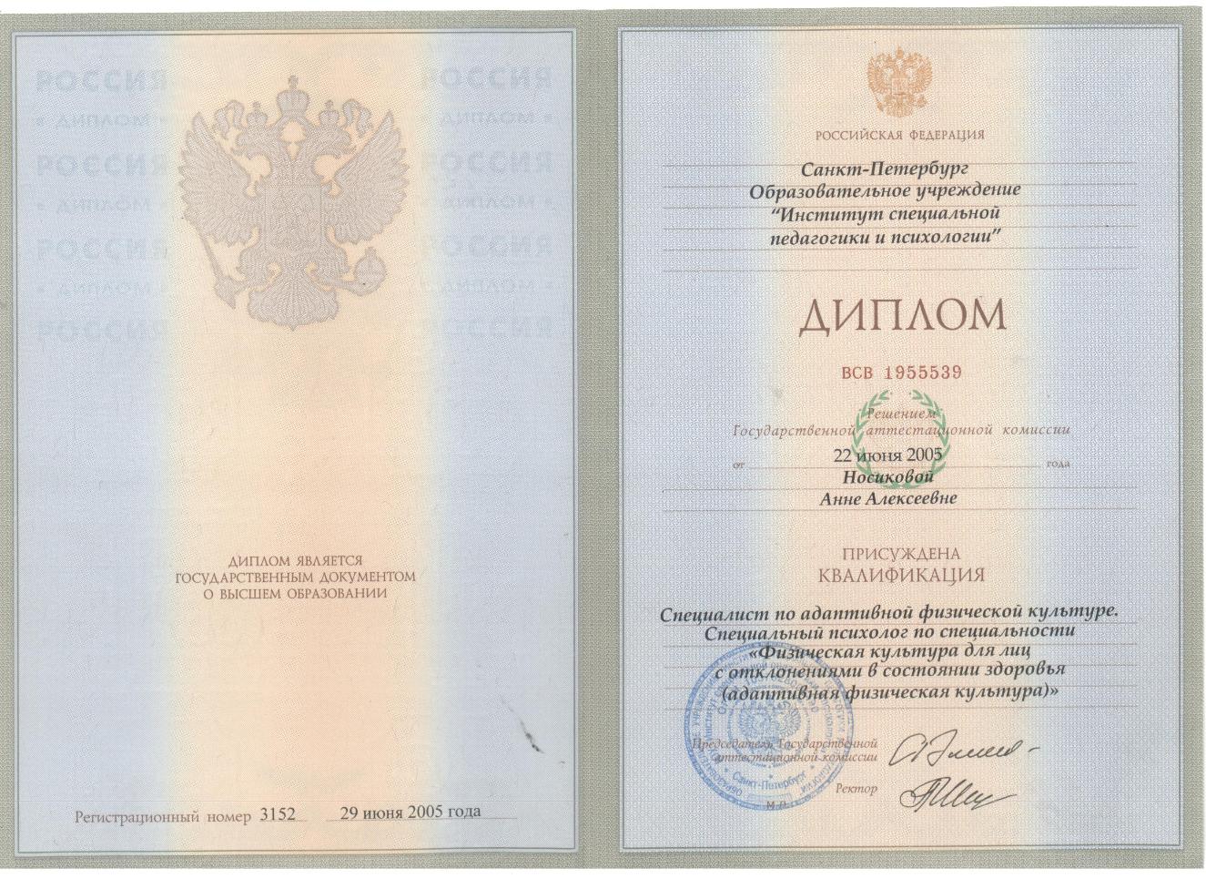 - Институт специальной педагогики и психологии, специальность «Специальный психолог для лиц с отклонениями в состоянии здоровья».
