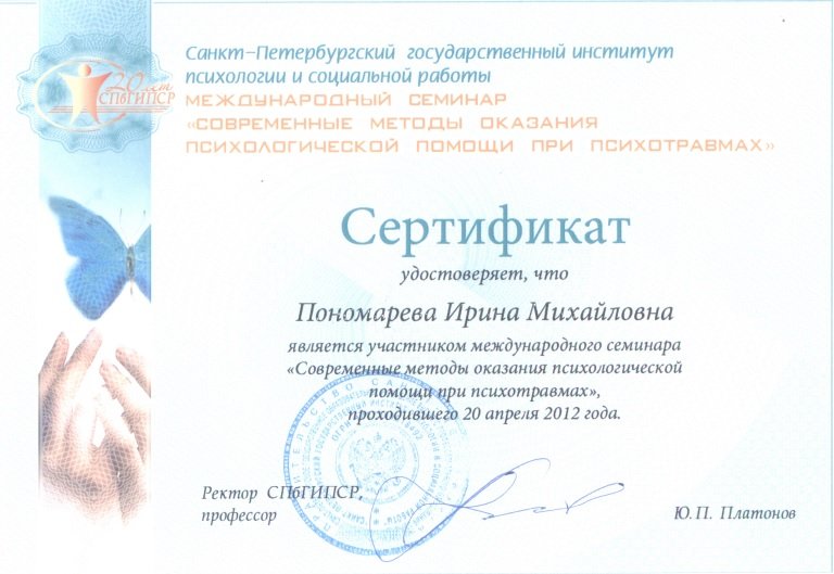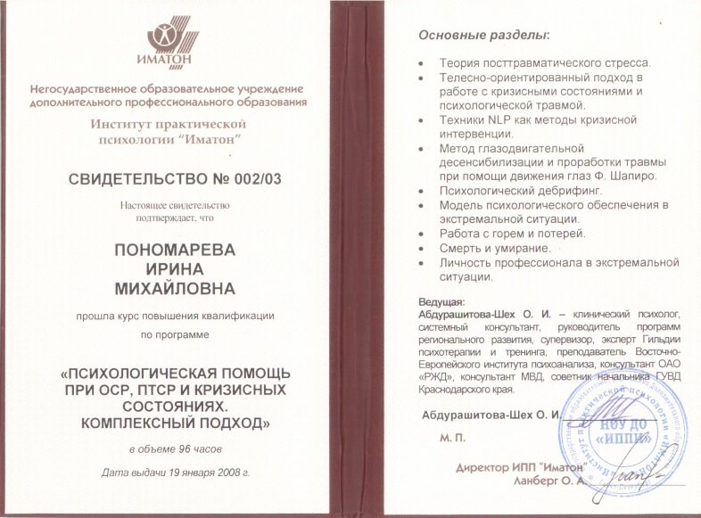 - Программа "Психологическая помощь при ОСР, ПТСР и кризисных состояниях. Комплексный подход". Институт практической психологии "Иматон".