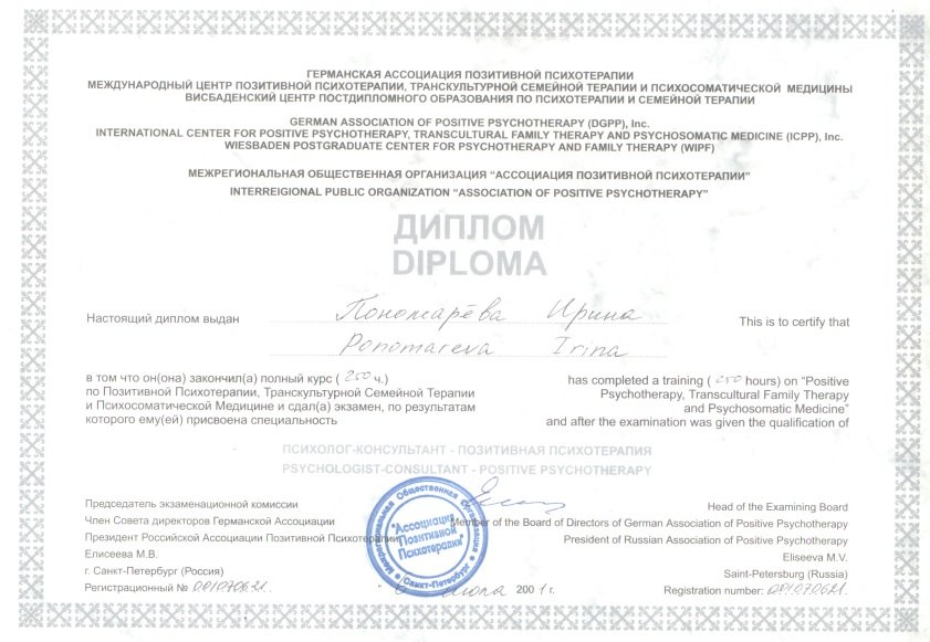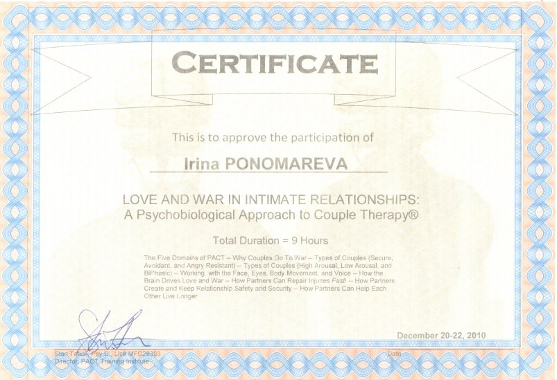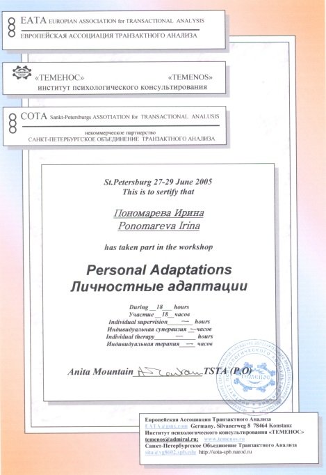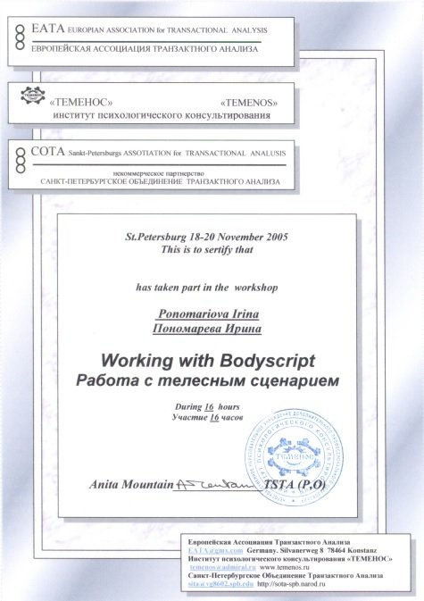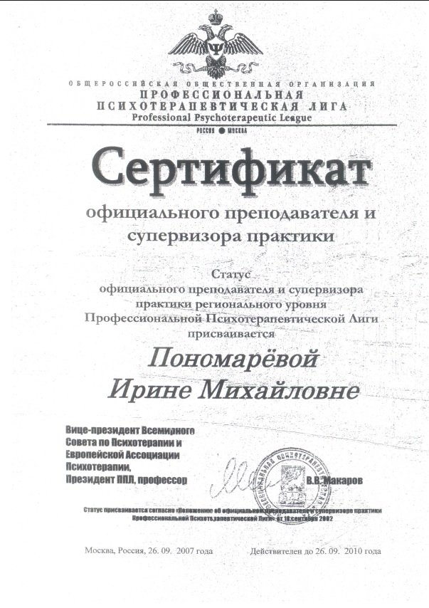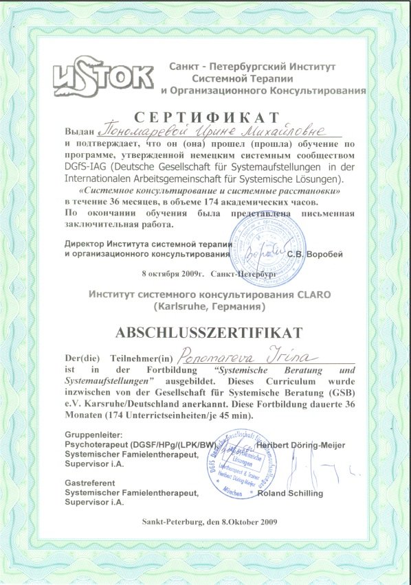 - Институт Системной Терапии и Организационного консультирования, международный сертификат, системный терапевт .