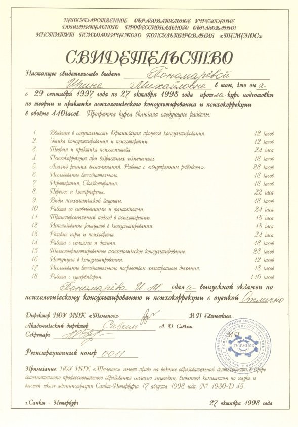 - НОУ Институт психологического консультирования "Теменос", психолог - консультант.