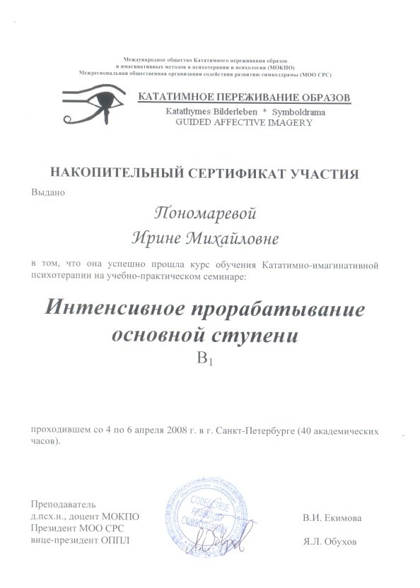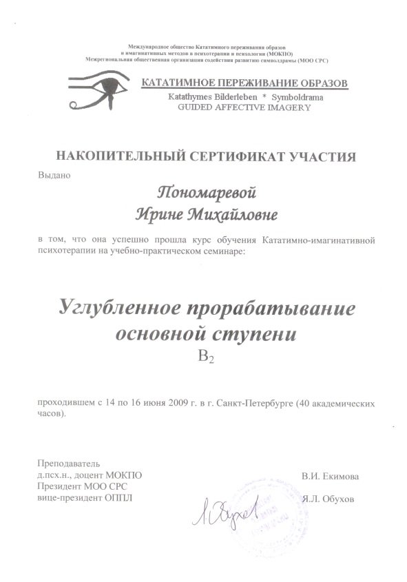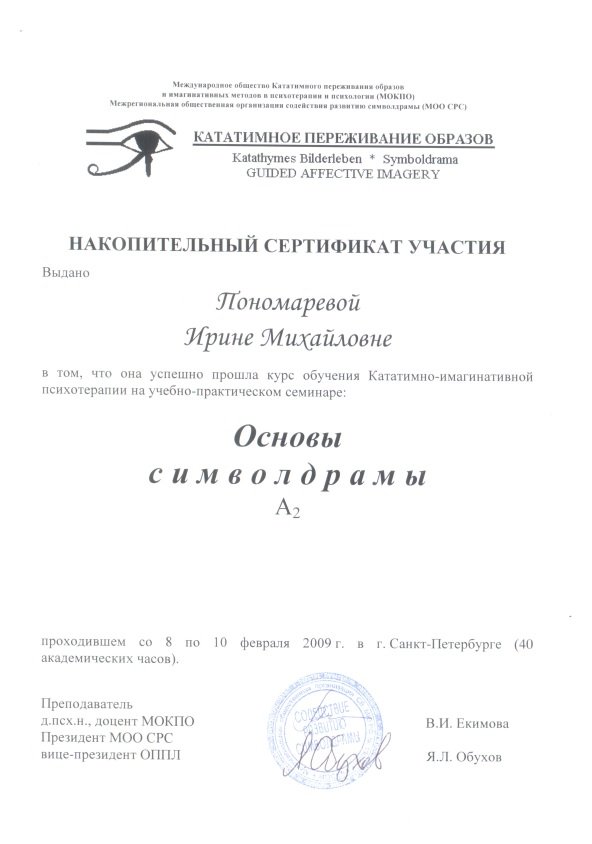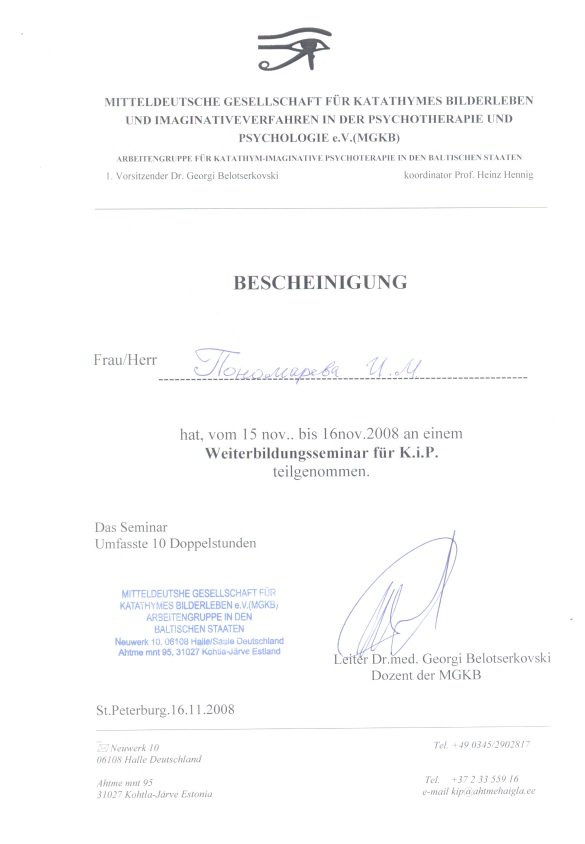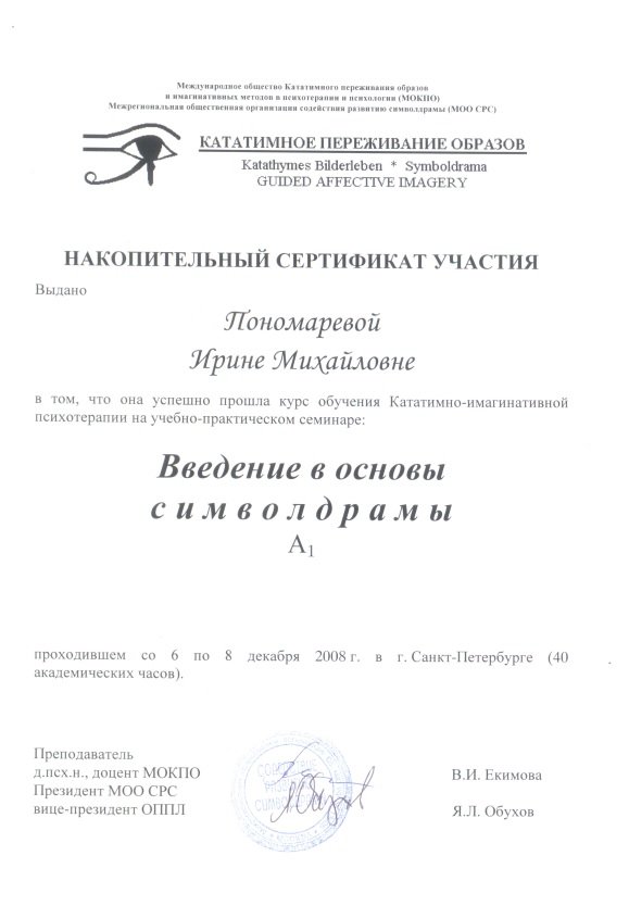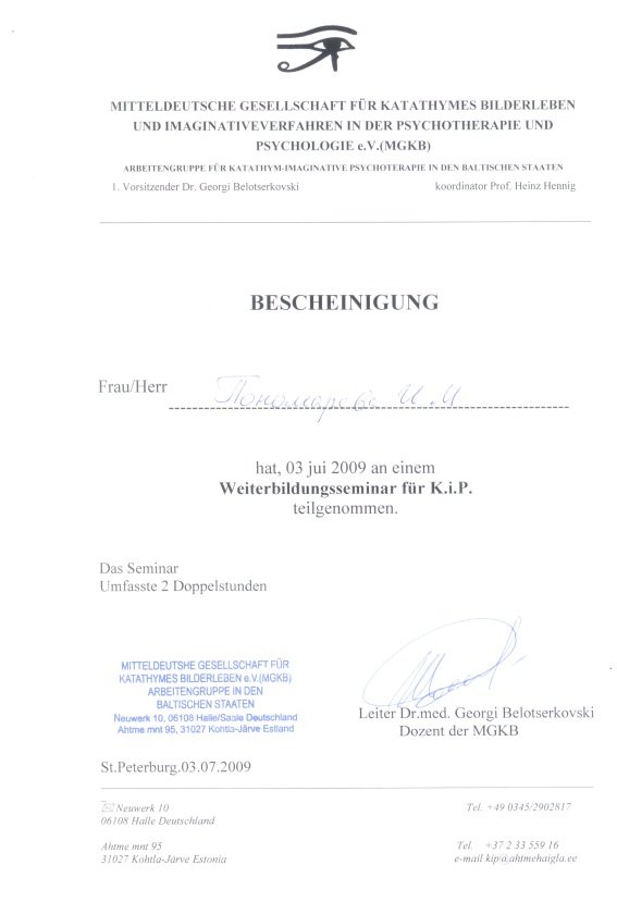 - Курс обучения Кататимно-имагинативной психотерапии: "Введение в основы символдрамы А1", "Основы символдрамы А2", "Интенсивное прорабатывание основной ступени В1", "Углубленное прорабатывание основное ступени В2".