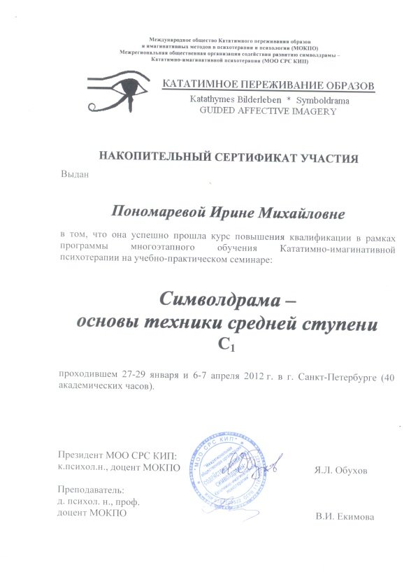 - Курс обучения Кататимно-имагинативной психотерапии: "Введение в основы символдрамы А1", "Основы символдрамы А2", "Интенсивное прорабатывание основной ступени В1", "Углубленное прорабатывание основное ступени В2".