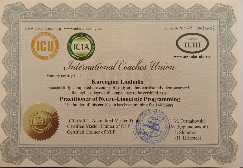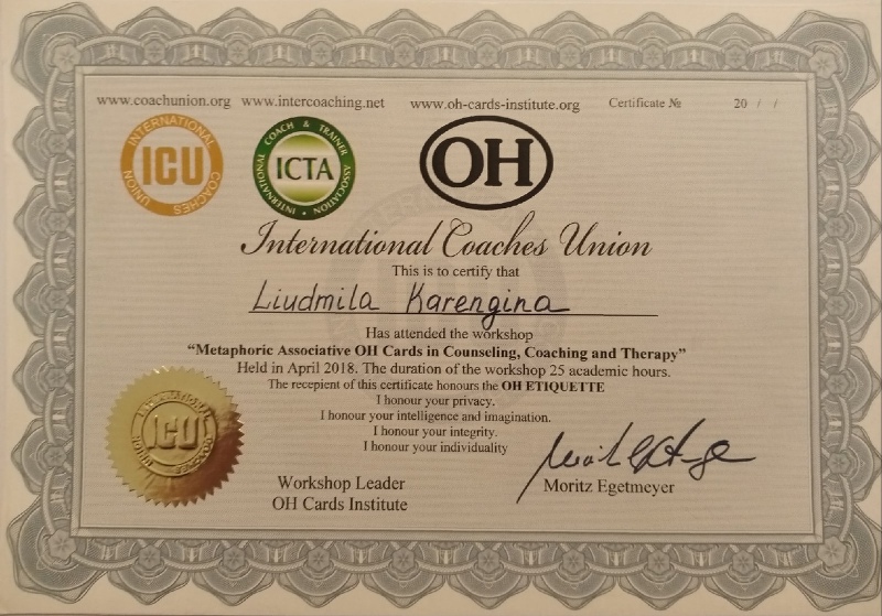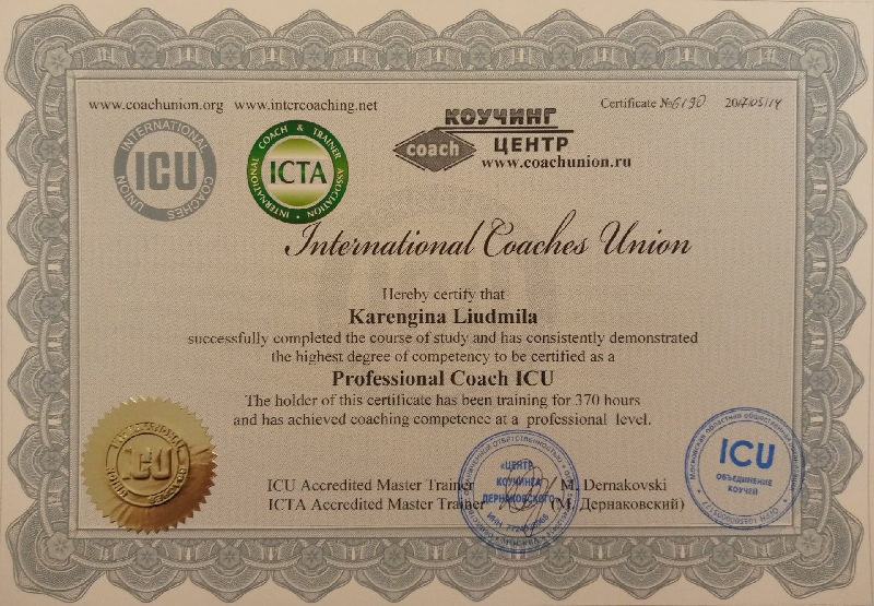 - ICU, "Профессиональный Коуч", "НЛП практик", "Арт терапия в коучинге", "МАК в консультировании, коучинге и терапии", прослушала курс по "Executive Coaching"