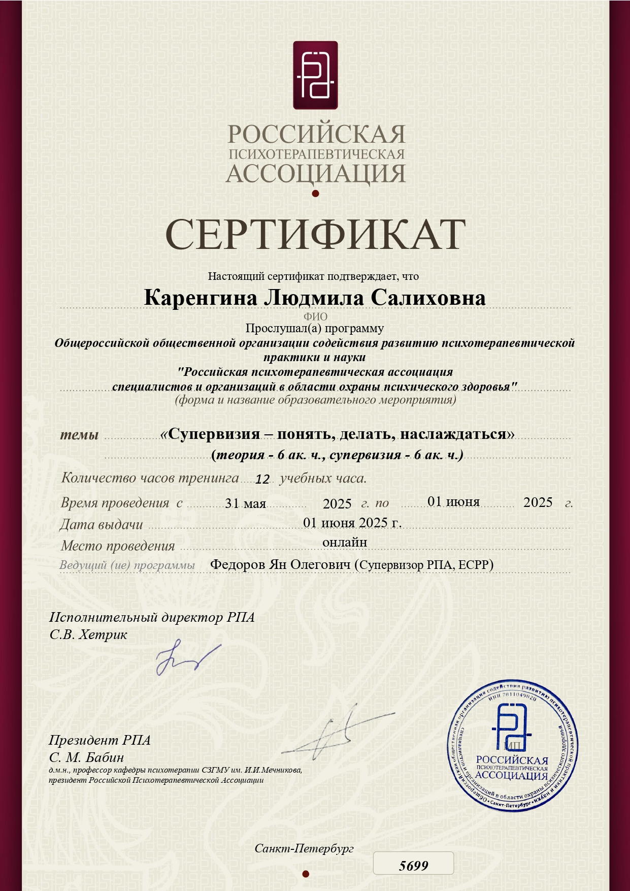 Дополнительная информация: 3 года в индивидуальной терапии, регулярная супервизия.