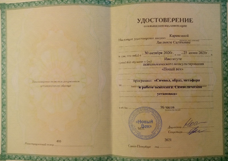 - Институт психологического консультирования "Новый век", профессиональная переподготовка, специальность "Психологическое консультирование".