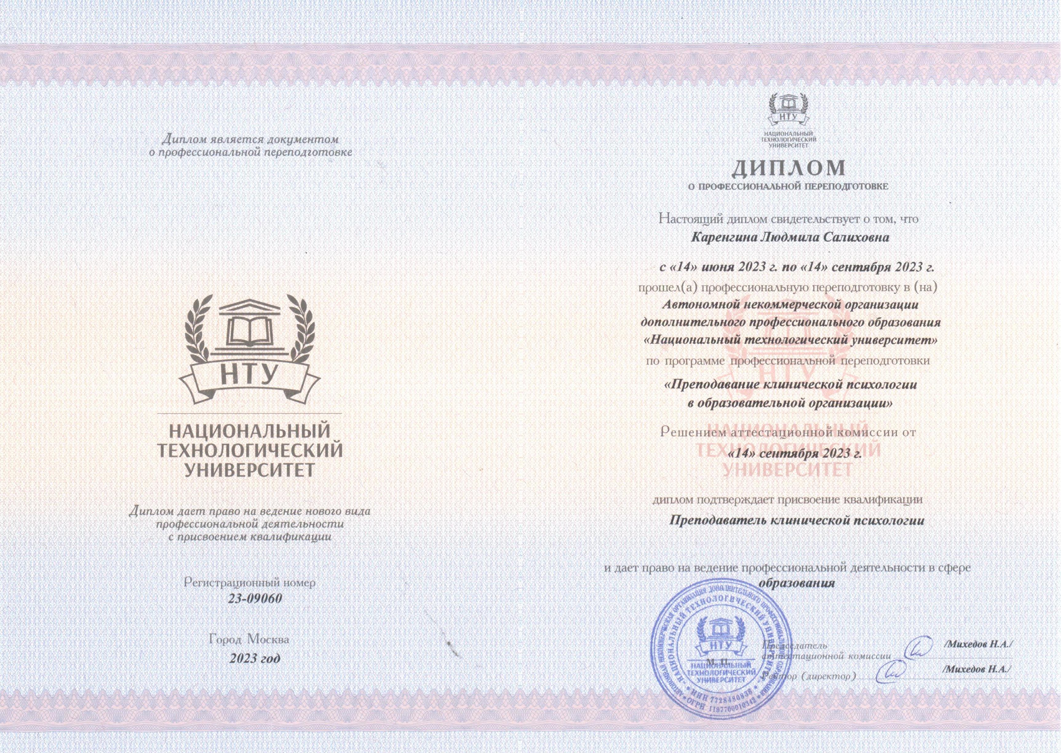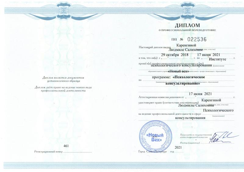 - Институт психологического консультирования "Новый век", профессиональная переподготовка, специальность "Психологическое консультирование".