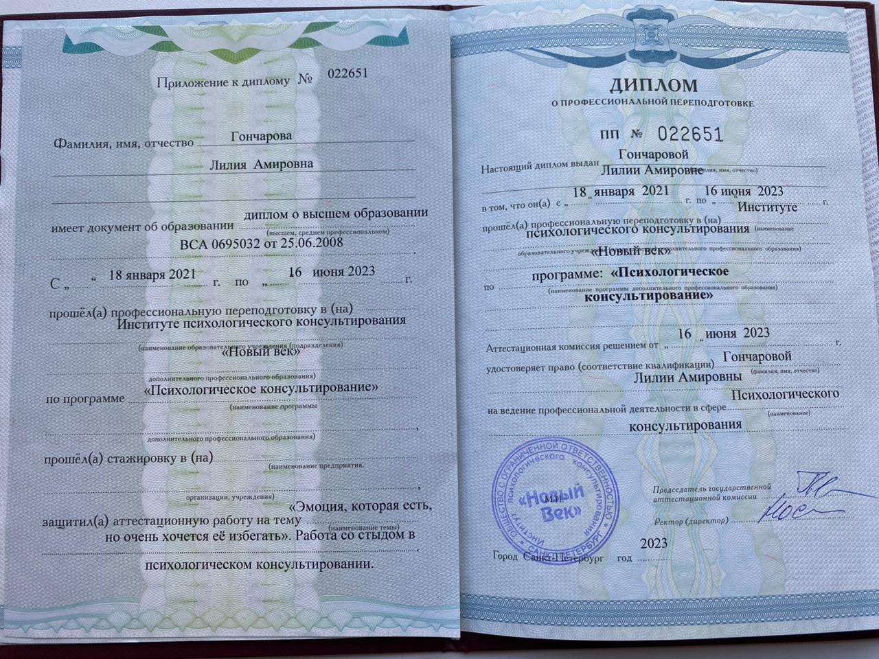 - Институт психологического консультирования "Новый век", профессиональная переподготовка, специальность "Психологическое консультирование".