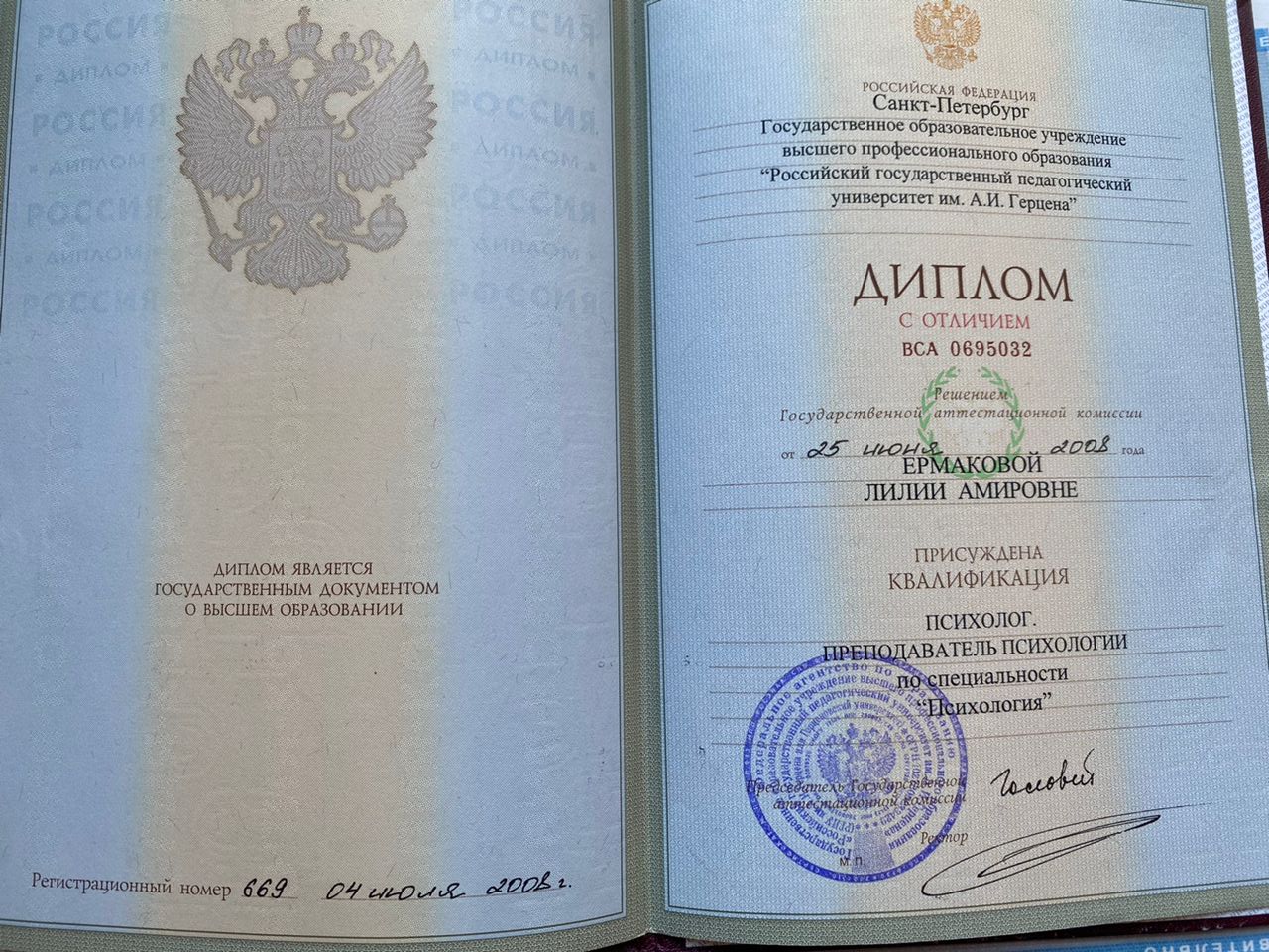 - Российский государственный педагогический университет им. А. И. Герцена, психолого-педагогический факультет, специальность «Психолог. Преподаватель психологии».