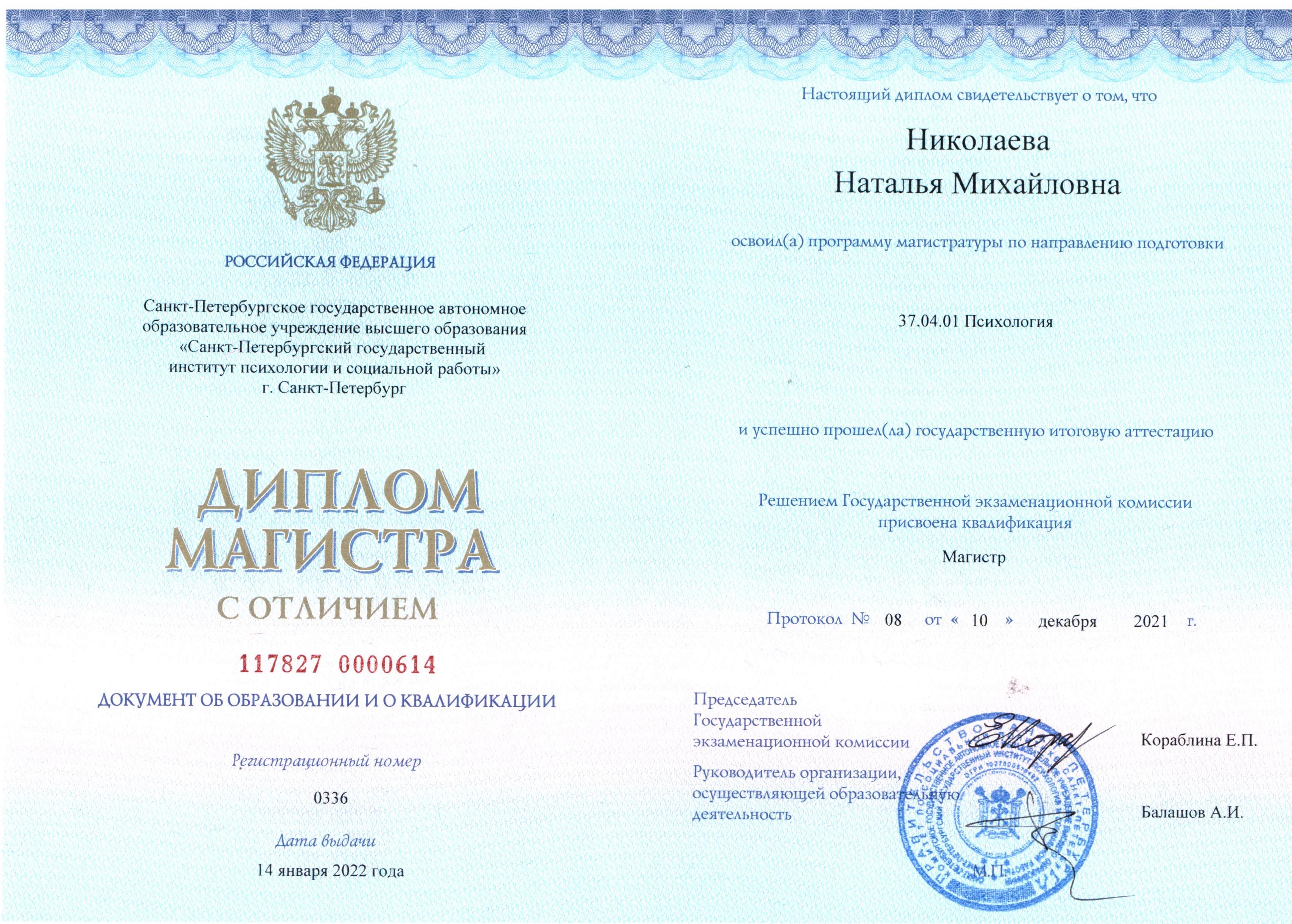 - 2019 – 2021 Санкт-Петербургский государственный институт психологии и социальной работы, магистр психологии.
