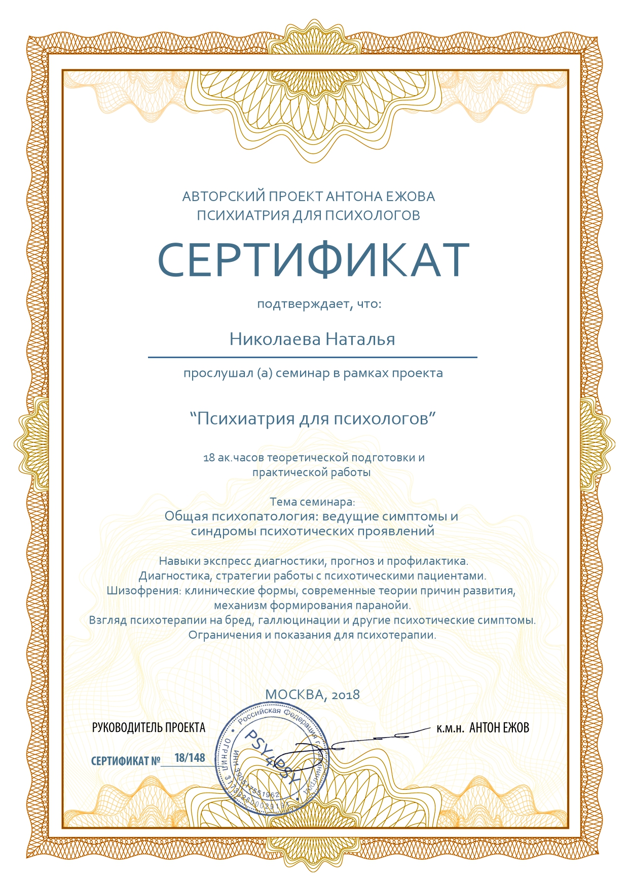 - 2018 Курс "Общая психопатология: ведущие симптомы и синдромы психотических проявлений".