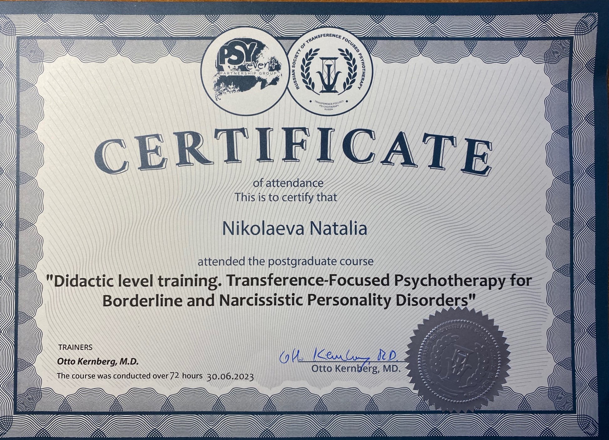 - 2023 Международный институт расстройств личности. "Терапия, фокусированная на переносе при пограничных и нарциссических расстройствах личности".