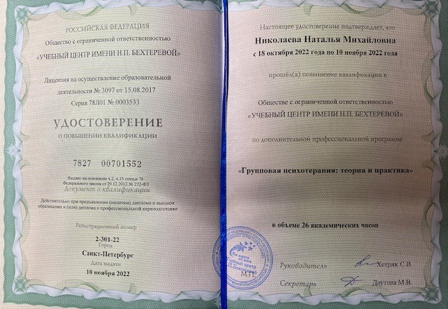 - 2022 Учебный центр им. Н.П.Бехтеревой. "Групповая психотерапия: теория и практика".