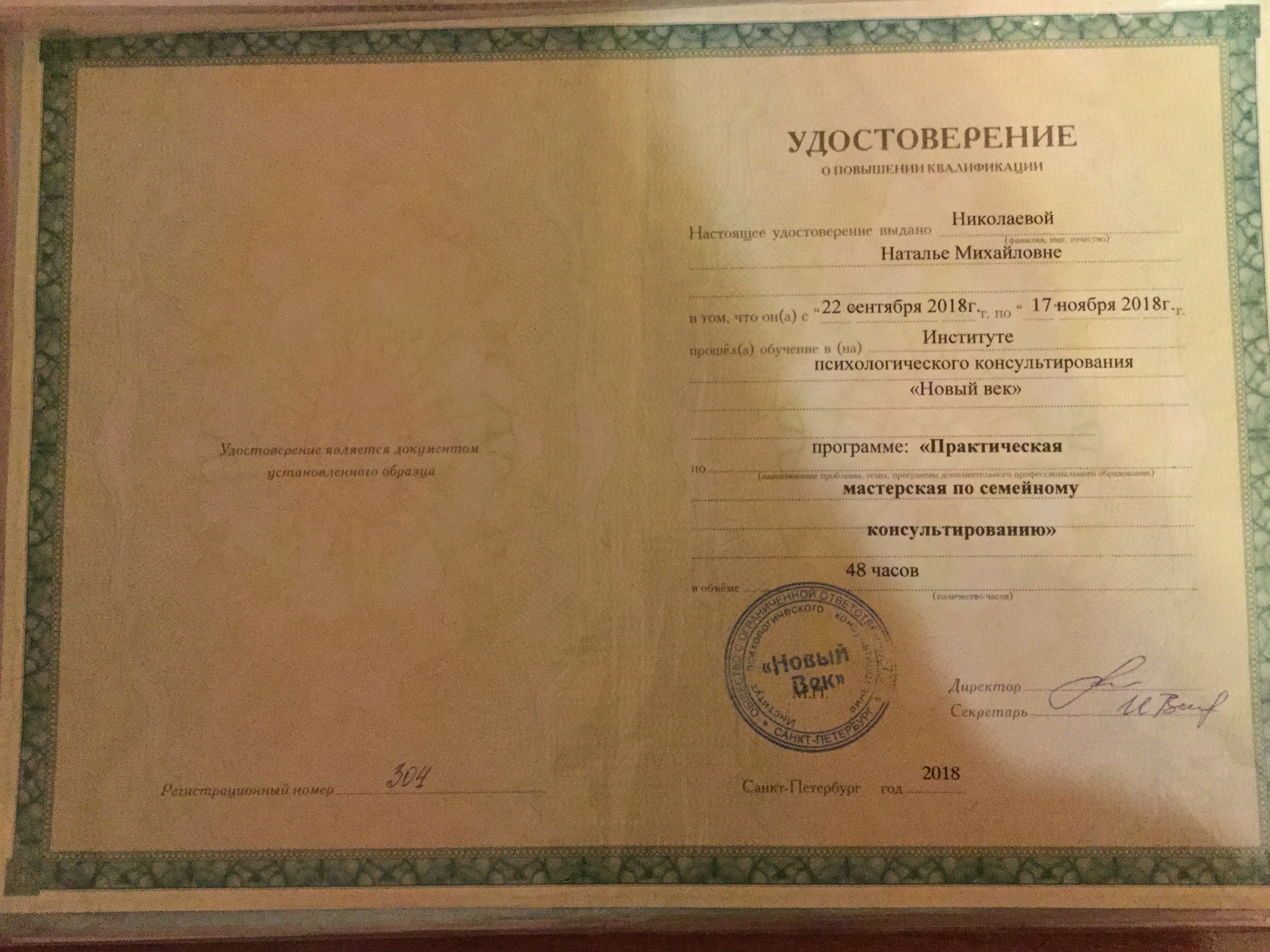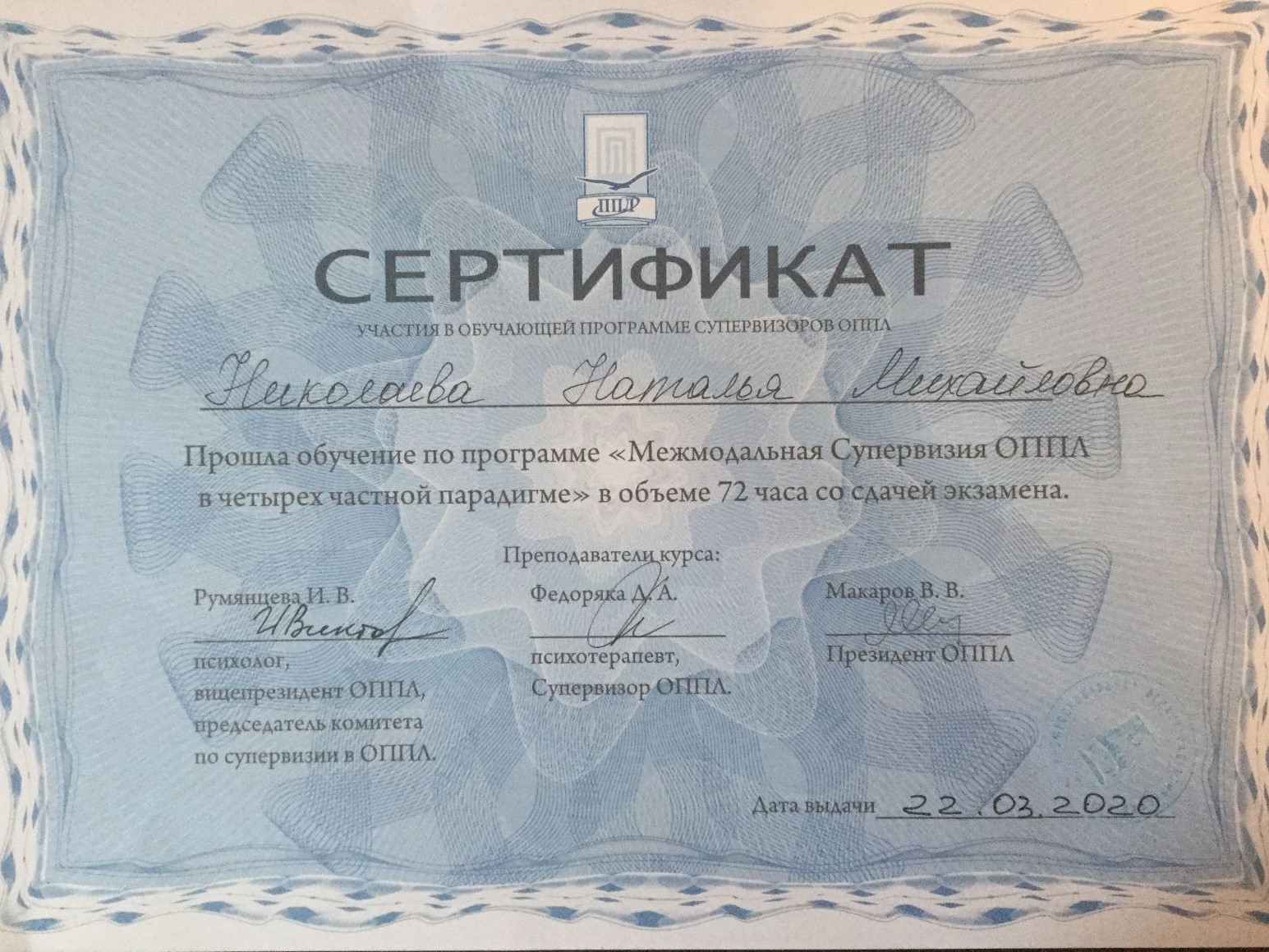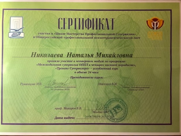 - 2021 Общероссийская профессиональная психотерапевтическая лига. "Тренинг супервизора - углубленный курс".