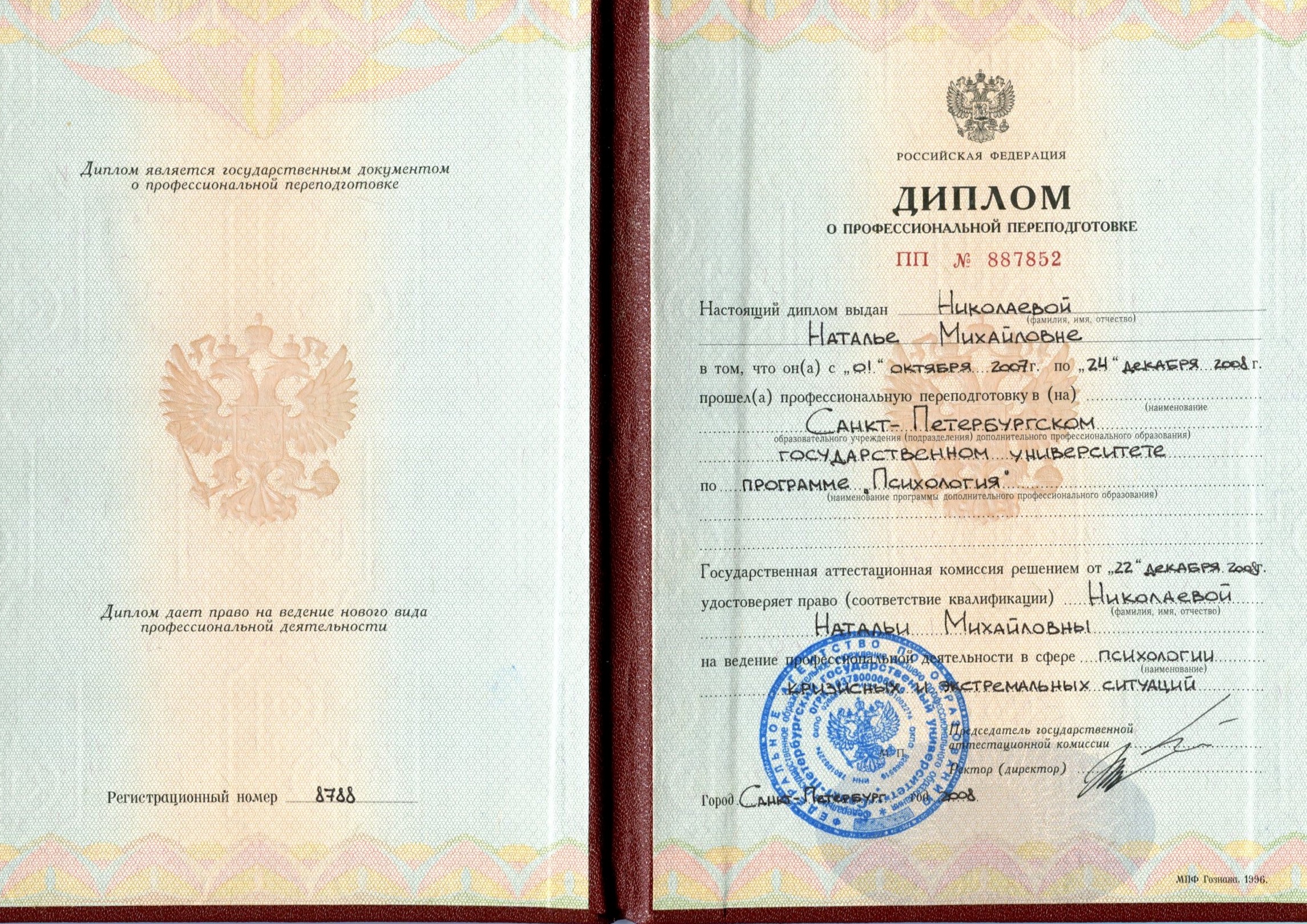 - 2007 – 2008 Санкт-Петербургский государственный университет (психология кризисных и экстремальных ситуаций).