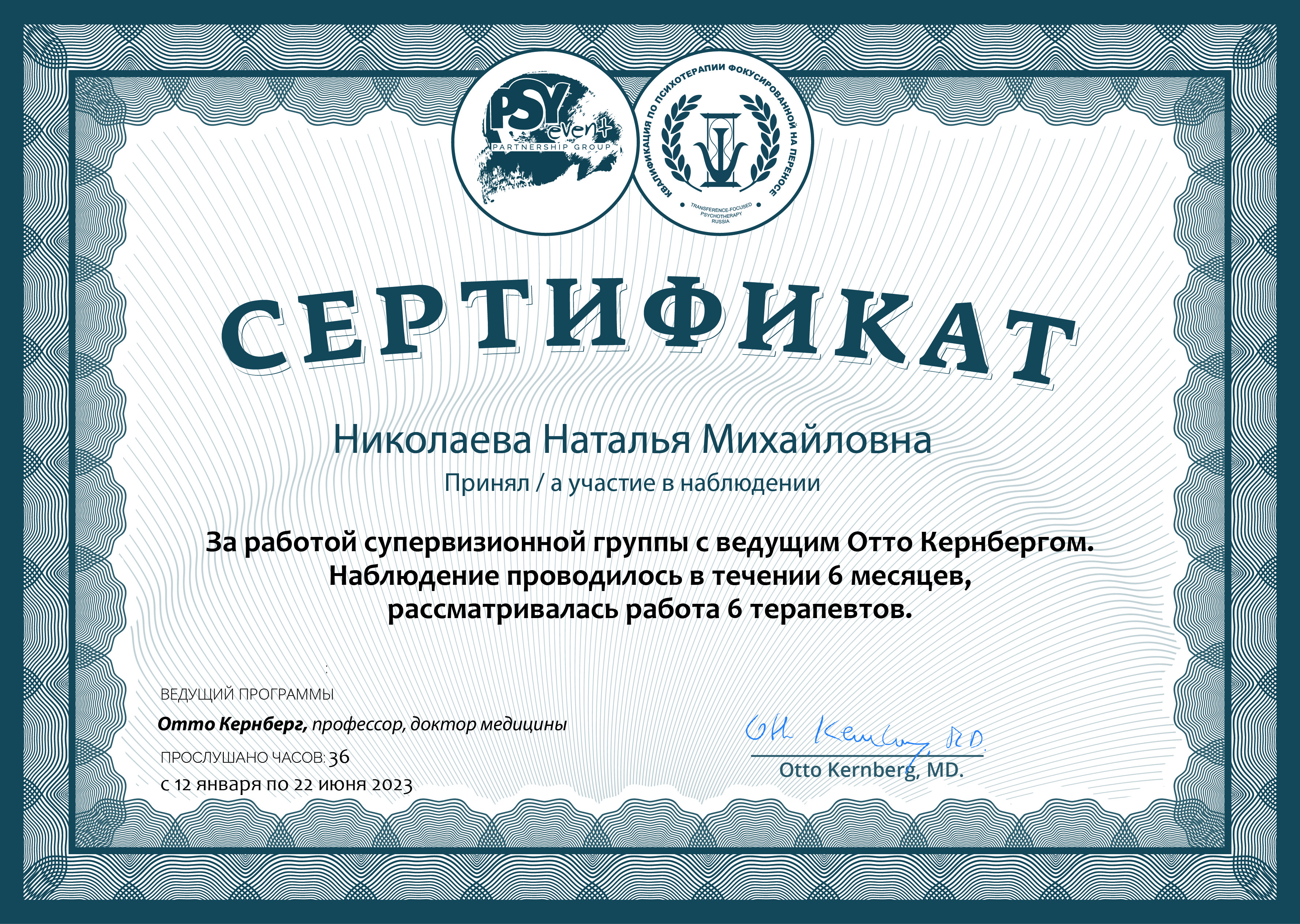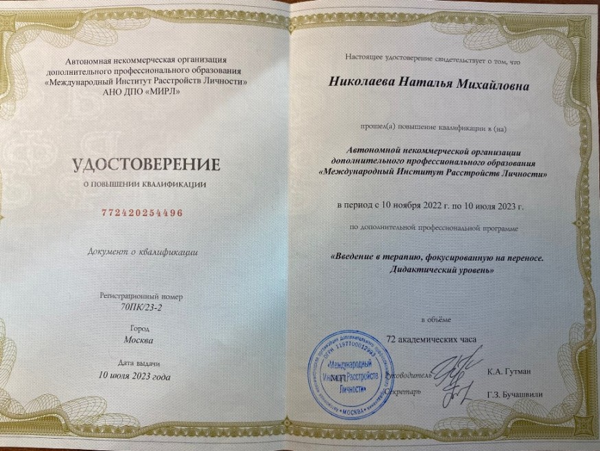 - 2021 Общероссийская профессиональная психотерапевтическая лига. "Краткосрочная психодинамическая терапия".