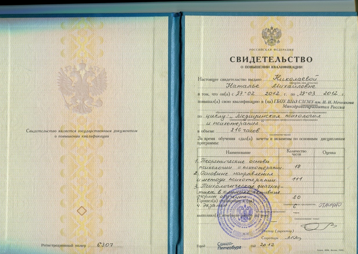 - 2012 Северо-Западный государственный медицинский университет им. И.И.Мечникова (медицинская психология и психотерапия).