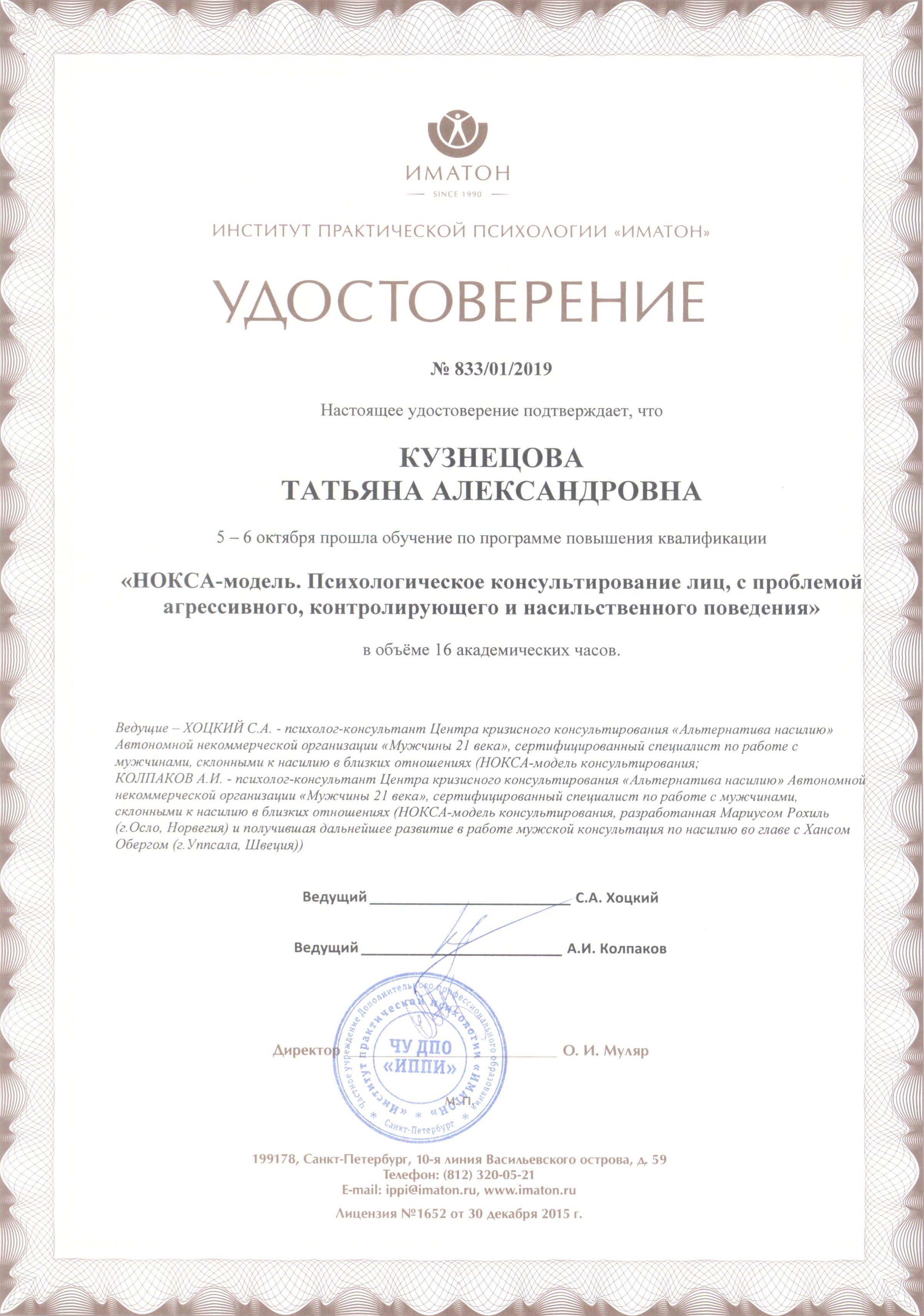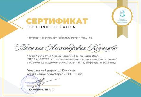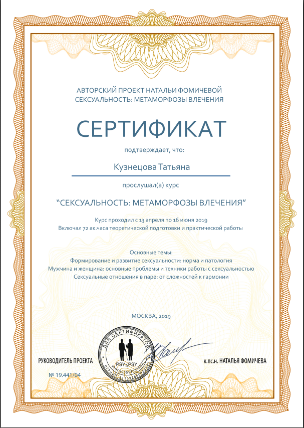 - Курс повышения квалификации: СПб Государственная педиатрическая академия «Вопросы детской и подростковой психиатрии».