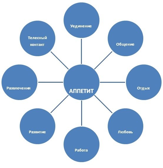 Предлагаю рассмотреть Рис.1 на котором видно, что аппетит может заменить множество удовольствий в жизни человека. Задача психотерапии направить внимание клиента на получение радостей жизни не от пищи, а от развития социальной жизни. Вернуть радость от общения с людьми, от телесных и сексуальных удовольствий.